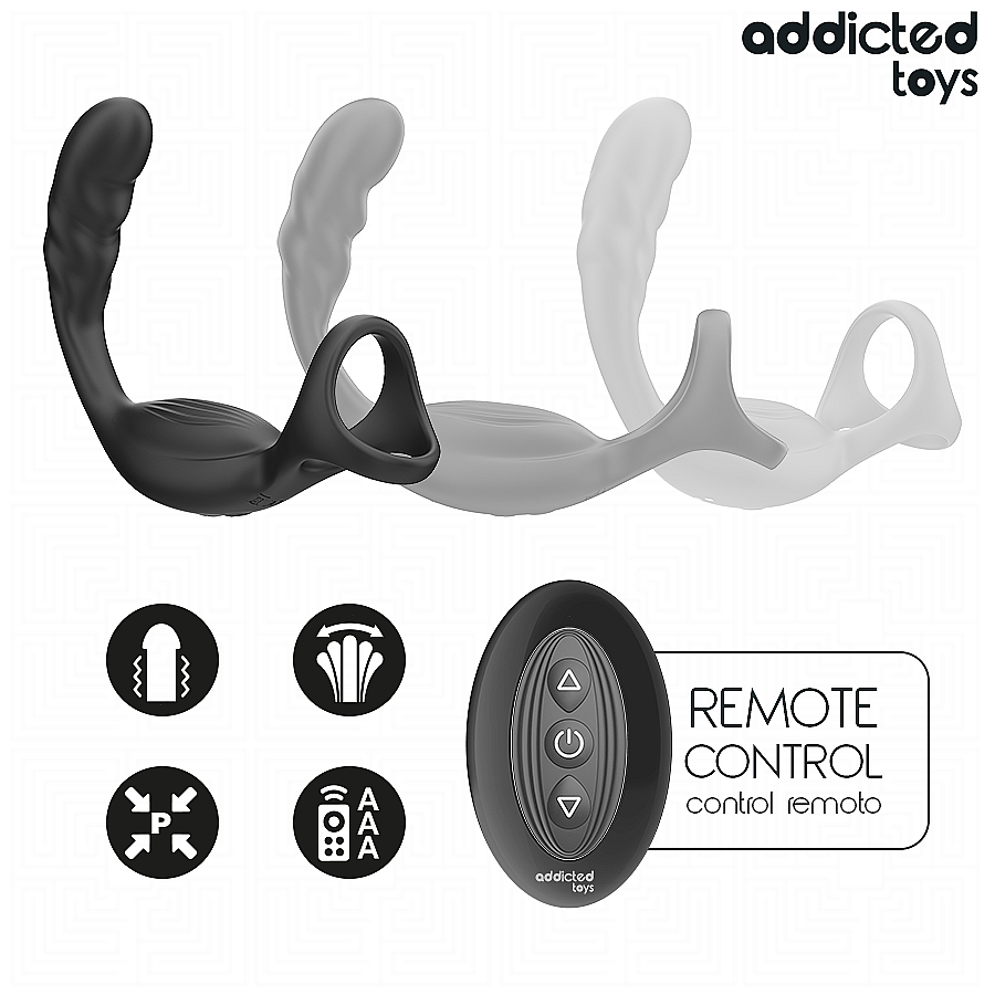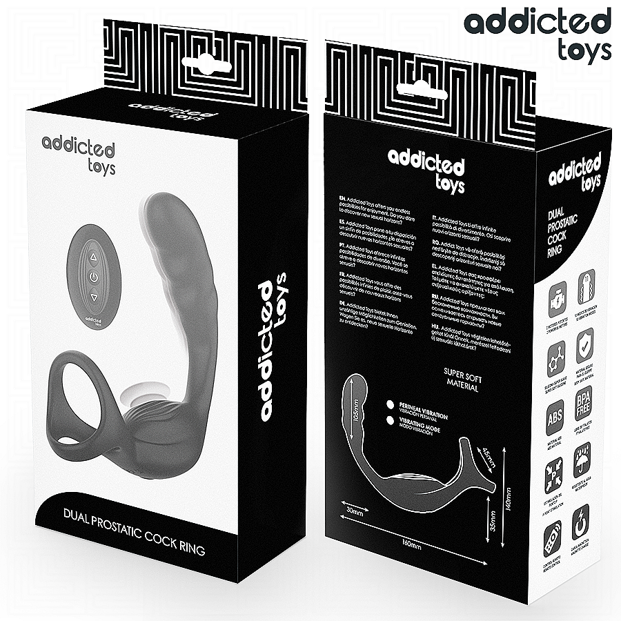 Addicted Toys Dual Prostatic Cock Ring is crafted to pamper the penis while accurately massaging the P-spot. Two powerful, independent motors deliver deep, targeted vibes so every rhythm hits the right zones. With 10 vibration modes, explore gentle waves or bold pulses at the press of a button. The double-ring design holds firm yet comfortably to enhance erections and prolong performance, while the curved arm zeros in on the prostate for intense internal thrills. A wireless remote adds freedom—fly solo or hand control to your partner. Ultra-soft silicone and premium ABS feel velvety, flex smoothly, and are phthalate-free for body-safe play. Magnetic charging keeps things neat and easy, and the water-resistant build invites spontaneous fun.