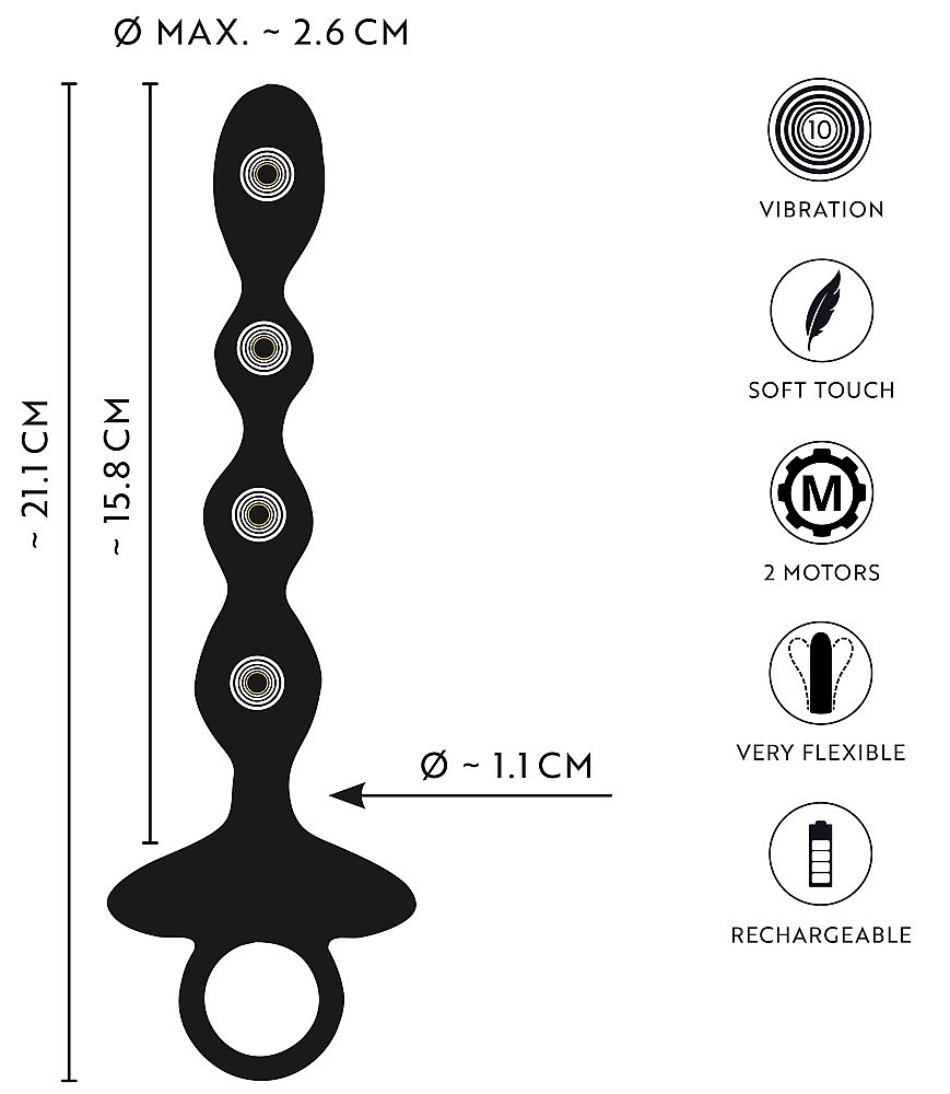 ANOS Flexible Anal Beads With Jumping Vibrations bring deep, intense backdoor pleasure with a playful twist. Four grooved vibro-beads stroke you one by one, while the silky-smooth silicone slides in gently for seamless comfort. Dual motors ignite 10 powerful vibration modes that you can swap with a single push-button, setting the tempo to your desire. A special jumping mode sends impulses hopping from bead to bead, surprising you with every wave and keeping the anticipation deliciously high. The extremely flexible body adapts to your movement, and the tapered design helps the beads stay securely in place. A wide stopper with a practical ring-shaped handle gives you confident control, easy guidance and pleasurable removal, while preventing overly deep insertion. Convenient USB charging keeps your toy ready for encore moments, and the balanced 93 g weight suits both solo exploration and couples’ play when you want an electrifying backdoor spark.