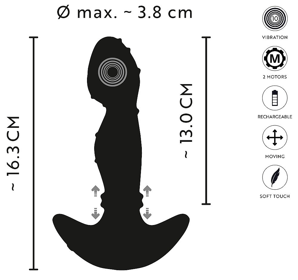 Vibrating Prostate Plug with Moving Rings by ANOS features a perfectly curved, grooved tip that hits the P-spot precisely and floods it with intense vibrations. Moving Rings glide up and down the anal rim to deliver a hot rimming massage that makes your toes curl. Mix and match 10 vibration modes with 3 massage speeds for endlessly exciting combinations. Two powerful yet quiet motors work reliably to send deep waves of pleasure. Control is effortless with a single button on the anal-safe anchor base, keeping everything at your fingertips. The silky-soft silicone slides in smoothly, feels great for longer wear, and loves extended play. The wide stopper keeps the plug perfectly in place and prevents over-insertion for safe, worry-free fun. When it’s time to recharge, just plug in the USB cable and get back to bliss fast.