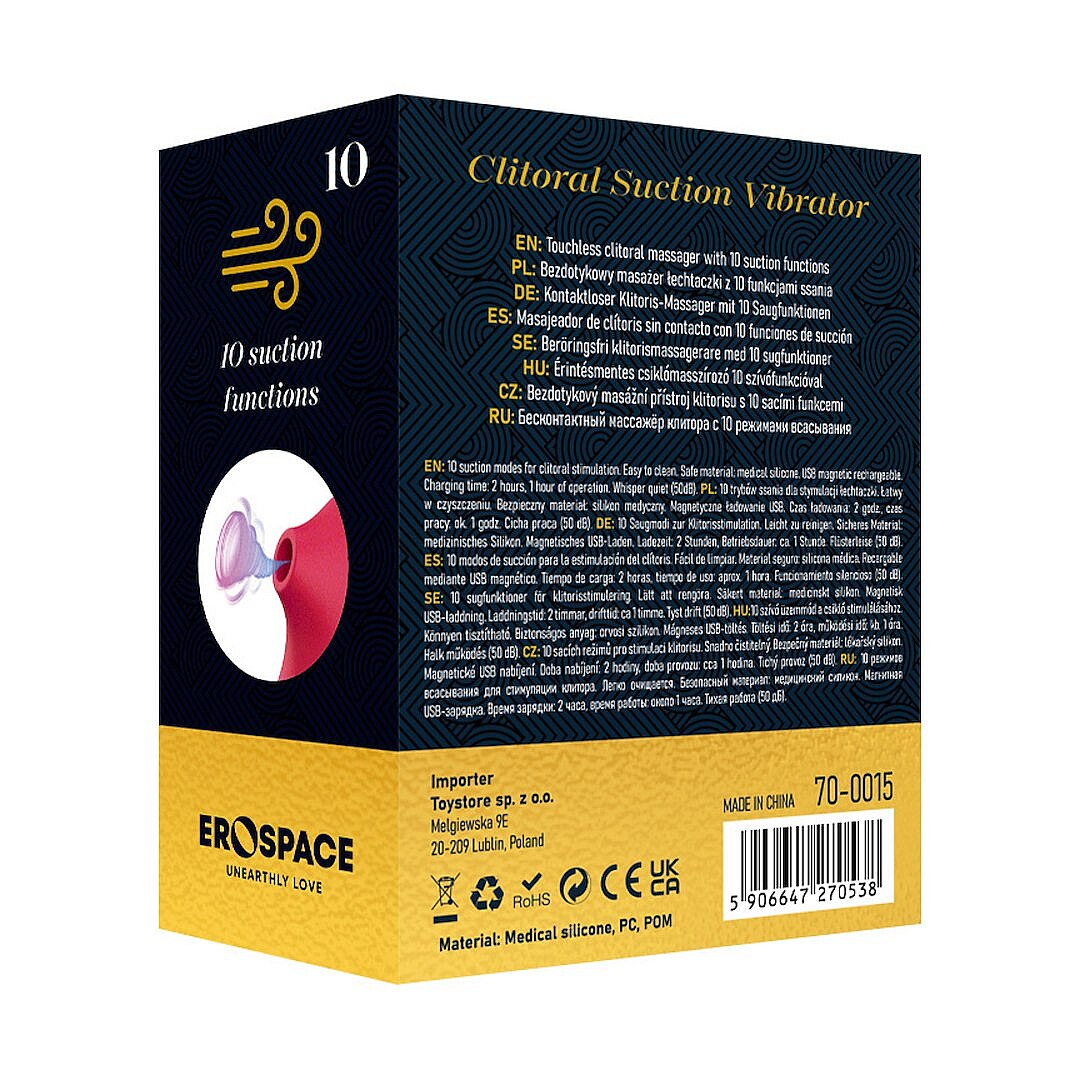 Sweet Play A15 Clitoral Massager by Erospace pampers the clitoris with a focused suction nozzle. Ten pulsation modes vary intensity and rhythm to match your mood and build arousal beautifully. An ergonomic heart-shaped handle nests securely in your palm for confident, slip-free control. Quiet operation up to 50 dB keeps every session discreet. With IPX6 water resistance, the shower becomes your sensuous playground. Skin-friendly medical-grade silicone feels silky, while robust PC and POM boost durability. Compact dimensions travel lightly and tuck away easily. A 700 mAh battery delivers up to 60 minutes of indulgence and recharges magnetically in 120 minutes—simple and fuss-free. Intuitive on-toy buttons make mode switching effortless, and the feminine design makes a delightful intimate gift.