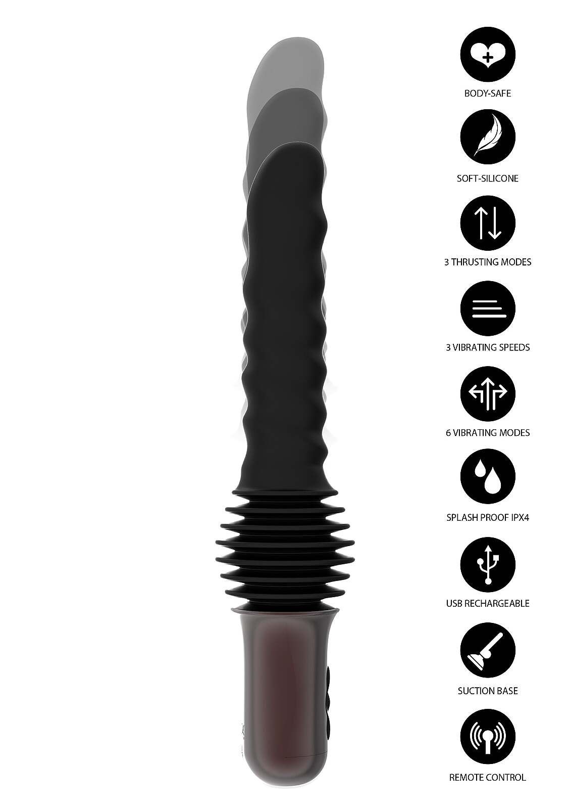 The Hidden Desire Anal Power Thrusting Vibrator is expertly engineered for effortless insertion and thrilling deep penetration. Its adjustable suction base means you can indulge in hands-free play and explore creative angles at your own pace. With up to 5 cm of thrusting motion, a total length of 37 cm (and an insertable length of 17.5 cm) delivers powerful stimulation right where you want it. The mighty motor goes up to 80 thrusts per minute, sending deep, rumbling vibrations throughout the shaft for an explosive and unforgettable orgasm. Crafted from 100% pure silicone for comfort and durability, this toy also features 9 vibration modes, 3 thrusting speeds, and is fully remote-controlled for effortless pleasure. Unleash your bold fantasies with the Hidden Desire Anal Power Thrusting Vibrator and discover new peaks of erotic delight.