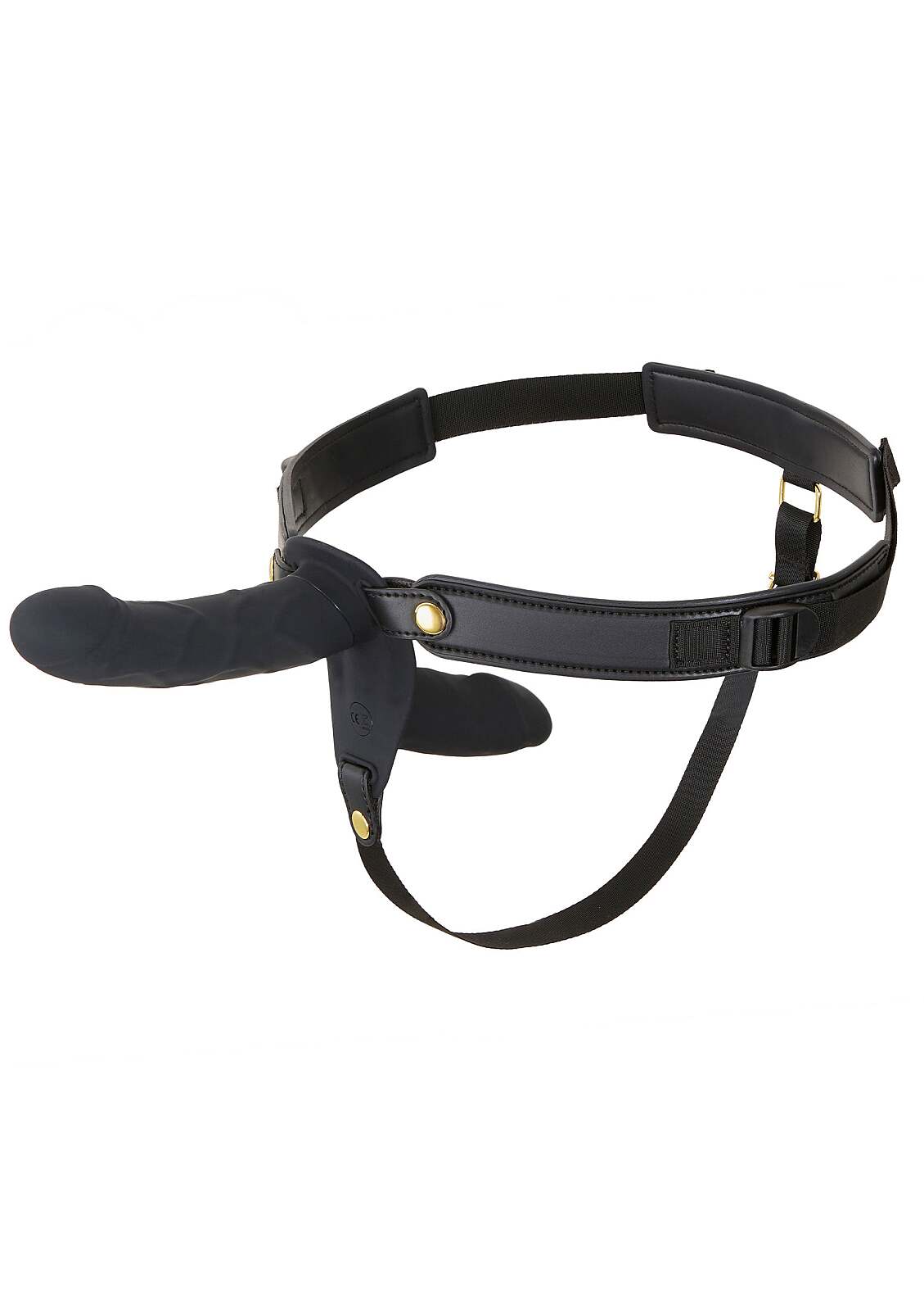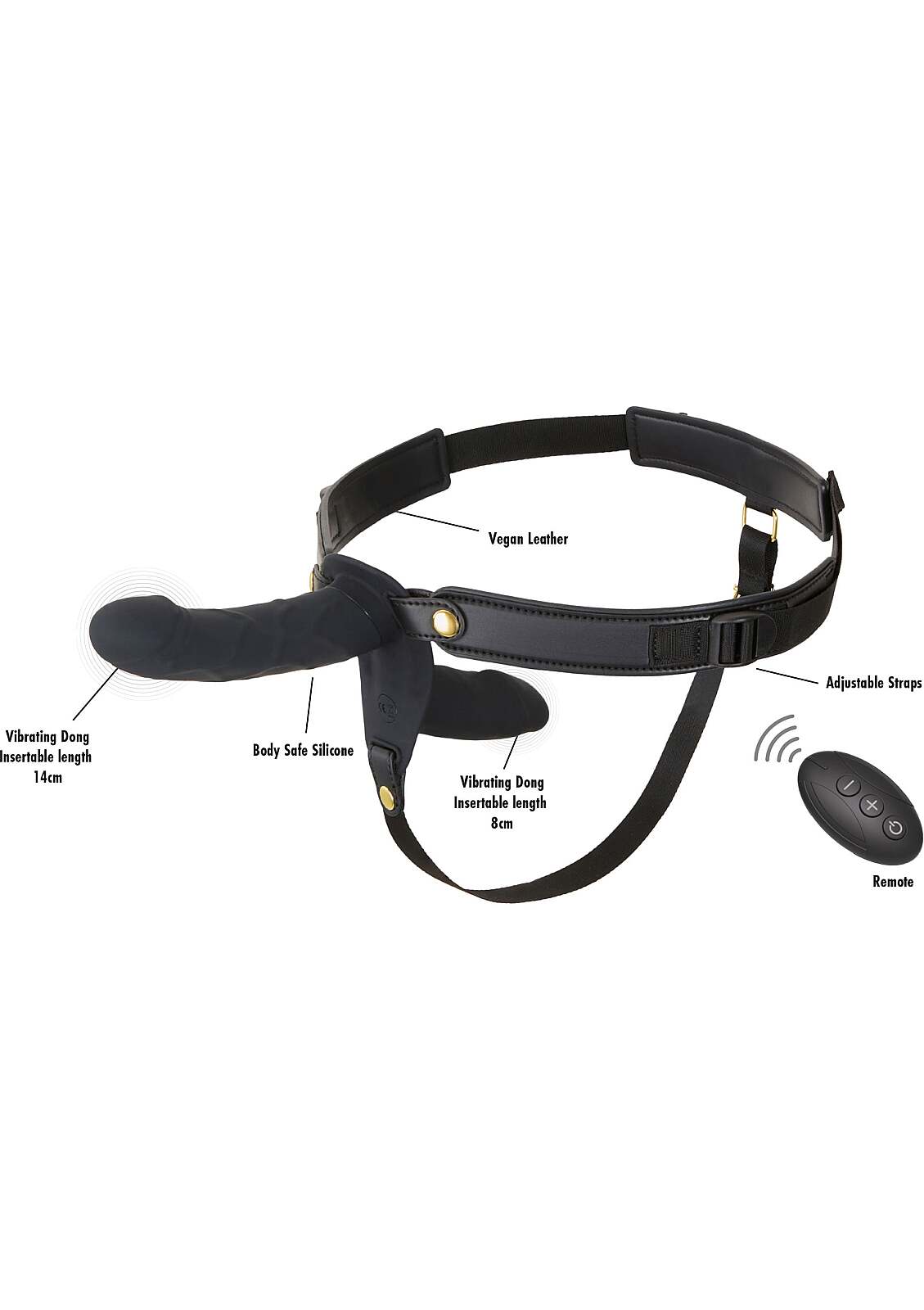 Double vibrating strap-on with 2 motors, wireless remote, 10 modes, inner stimulator for the wearer and a realistic 14 cm dildo. Body-safe silicone, adjustable harness, IPX5, rechargeable Li-ion.