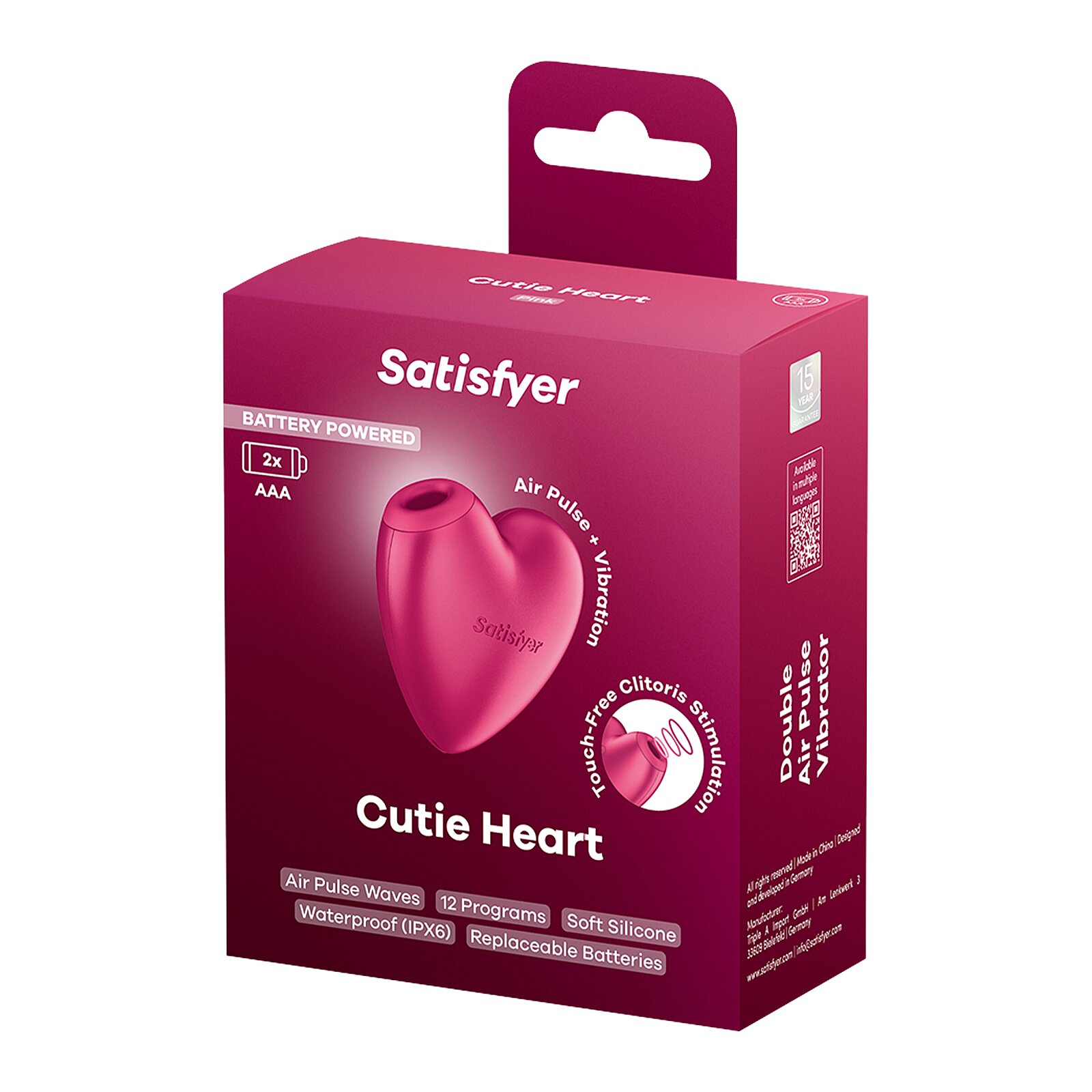 The Cutie Heart Battery Series (Pink) by Satisfyer pairs air-pulse pressure waves with deep vibrations for toe-curling clitoral pleasure. Two independently controlled motors let you blend 11 air-pulse intensities with 12 vibration programs for endless combinations. Its compact heart-shaped design nestles perfectly in your hand and travels discreetly. Ultra-soft, body-safe medical-grade silicone feels silky and stays hygienic. With IPX6 waterproofing, it’s ready for splashy showers or steamy baths, while whisper mode keeps moments discreet. Battery-powered by 2× AAA (not included), it’s always ready—just pop in fresh batteries and play, no charging time needed.