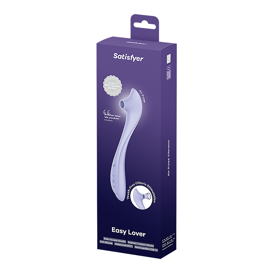 Satisfyer Easy Lover delights with dual stimulation – air‑pulse waves and deep vibrations – turning every session into a playful crescendo. Its extended stimulation nozzle cuddles your body and teases the clitoris right where it thrills. The ergonomic handle rests securely in your hand, keeping control effortless and precise even during long indulgent moments. With 11 Air Pulse intensities and 13 vibration programs, you can mix and match from a teasing whisper to a roaring climax, always in total control. Two separately controllable motors throb and purr to your mood while Satisfyer Easy Lover stays discreet in whisper mode. Super‑soft, body‑friendly silicone glides silkily and stays hygienic. IPX7 waterproofing invites you to bath and shower play, amplifying sensations with water’s embrace. A rechargeable Li‑ion battery with USB‑C keeps it ready, easy cleaning simplifies care.