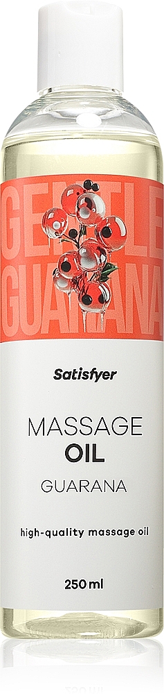 Satisfyer Massage Oil 250 ml (Guarana) sparks energy and awakens imagination. The vibrant yet tender guarana aroma with notes of roasted coffee stirs desire, while chocolate and vanilla nuances soothe the senses into deep relaxation. Its silky texture glides effortlessly, tracing every curve and inviting longer, playful strokes. Nourishing botanical oils leave skin soft and supple, turning each touch into an invitation for more. An energizing effect gives your massage a pulsing rhythm and restores your drive after a long day. The neutral, gentle formula is versatile—perfect for partner massages and a self-care ritual that transforms your bathroom into a private spa. Use a small amount in your palms, massage gently, and let the instant care unfold; if you crave more, simply reapply a few extra drops. A signature South American scent lends every touch an exotic accent and reminds you that your skin deserves pampering as much as your desires.