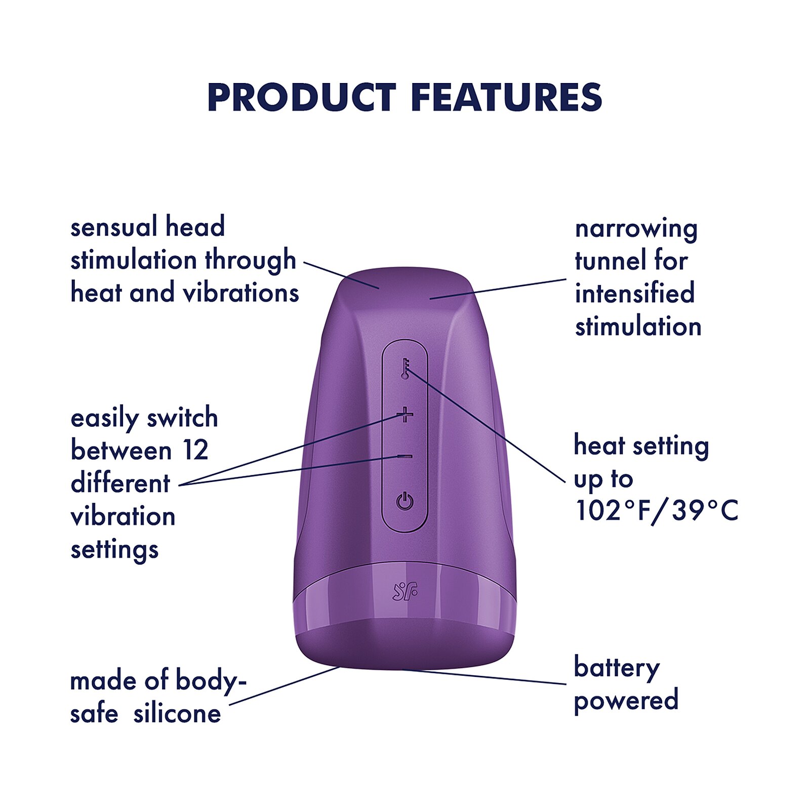 With the Satisfyer Men Heat Vibration Battery Series (Dark Berry), you get lifelike warmth up to 40°C that wraps your glans in a soft, arousing glow. Twelve powerful vibration programs take you from a slow build to explosive peaks. Whisper mode keeps things discreet while you enjoy unabashed pleasure. IPX6 waterproofing invites steamy shower sessions where heat and water amplify sensation. The silky, body-safe silicone tunnel feels velvety smooth and cleans effortlessly. Its wide opening works even when flaccid—insert, heat up and let arousal climb. One-hand control via intuitive +/- buttons and 3× AAA batteries (not included) make it a reliable, travel-ready companion.