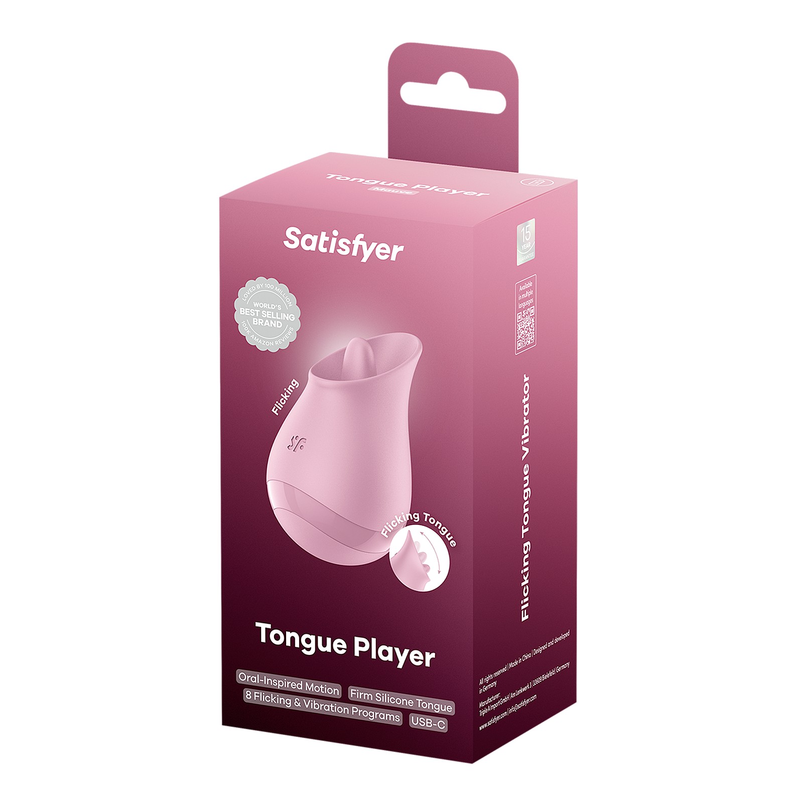 Satisfyer Tongue Player (Mauve) features a flicking silicone tongue that imitates realistic oral stimulation and tickles the clitoris with precision. 8 licking modes range from soft teasing to bold, rhythmic flicks. 8 vibration programs add deep, rumbly thrills for tailor-made pleasure. The super-soft, body-safe silicone feels velvety and amplifies every pulse. An ergonomic shape sits perfectly in hand for effortless control. The whisper-quiet motor keeps your moments discreet, while IPX7 waterproofing invites shower play and makes cleaning easy. With USB‑C recharge and a lithium-ion battery, it’s always ready when you are.