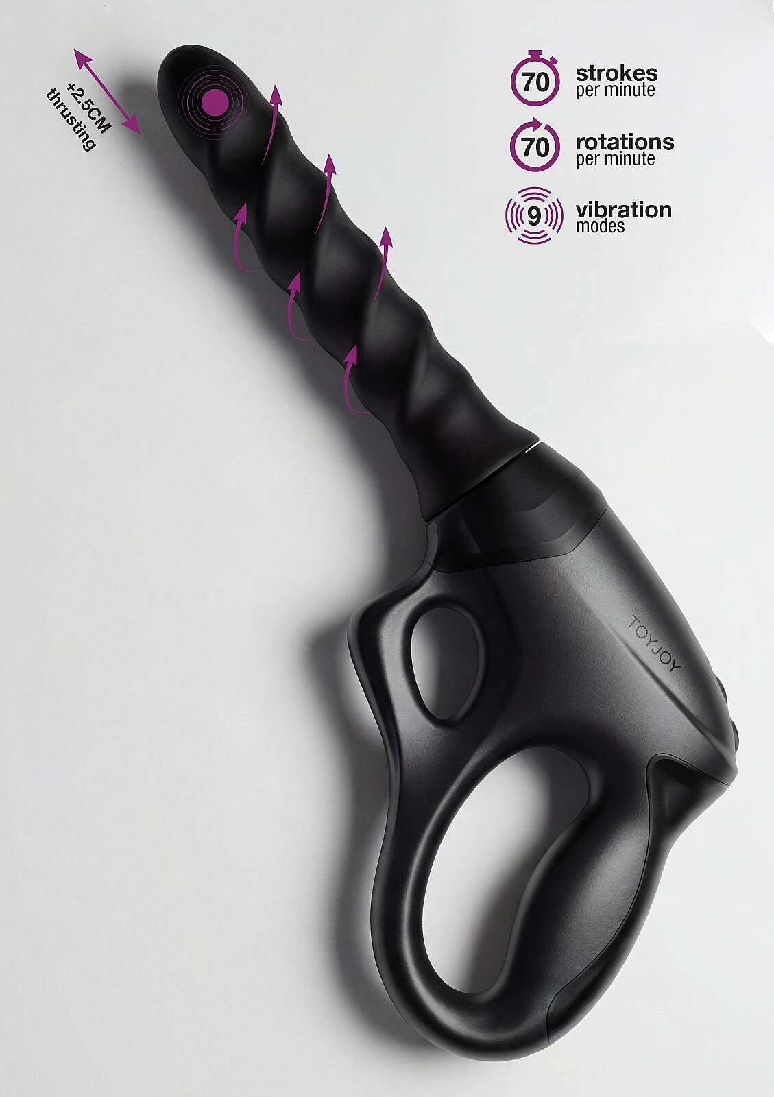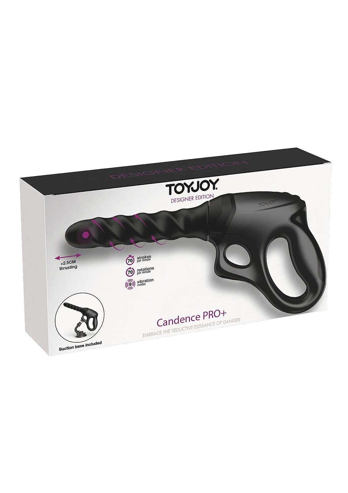 TOYJOY Designer Edition Cadence Fatale PRO+ is crafted for intense satisfaction and bold exploration. The pistol‑grip handle gives firm, effortless control. Patented 360° rotation swirls inside to heighten every second. A 2.5 cm thrust at 70 strokes per minute pairs with 70 rpm for an immersive ride. 9 vibration modes match your mood—from steady pulse to daring twist. The adjustable suction stand turns it into a true hands‑free sex machine. Perfect for vaginal and anal play, with silky silicone and sturdy ABS for comfort and confidence. The 16 cm insertable length delivers depth right where you want it. With IPX6 water resistance, it loves wet scenes too. The rechargeable design keeps the momentum when your body craves more.